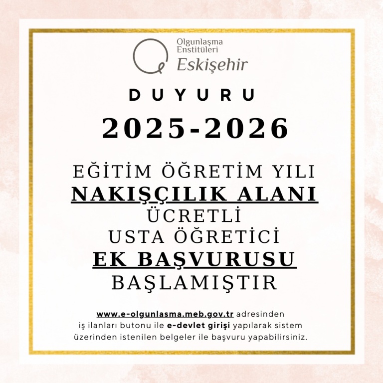 Enstitümüzde 2025-2026 Eğitim-Öğretim Yılı Tema/Proje kapsamında “Nakışçılık” alanında çalıştırılmak üzere ücretli ek usta öğretici alımı yapılacaktır. İlan detayları aşağıda belirtilmiştir.
